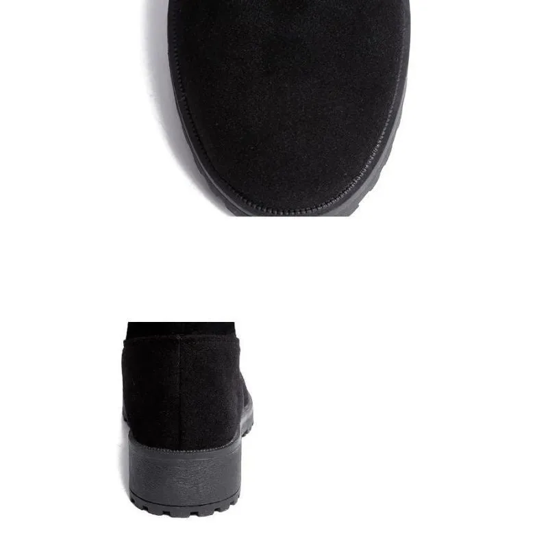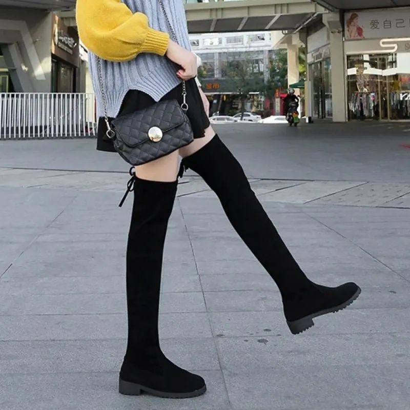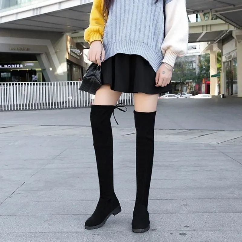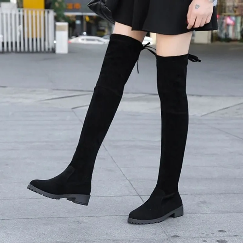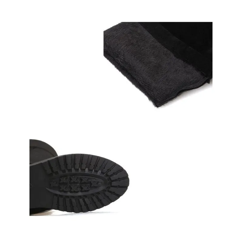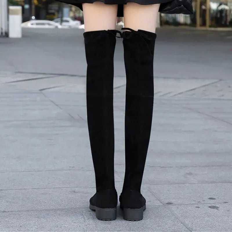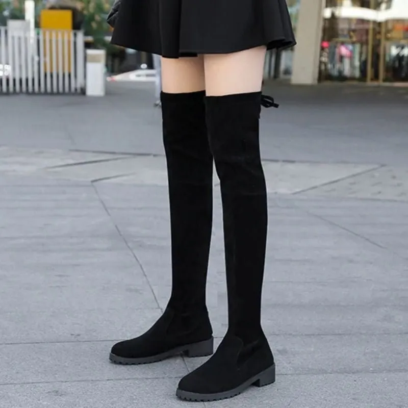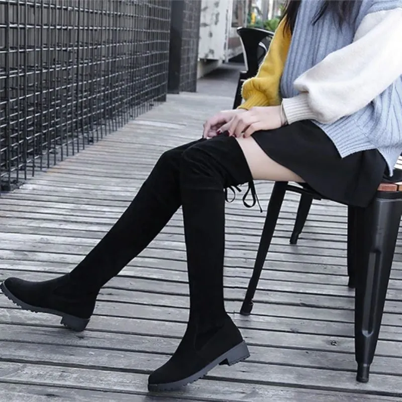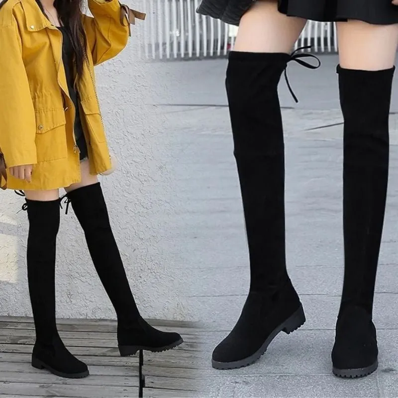 Bota preta de cano alto acima do joelho, possui salto pequeno e discreto.