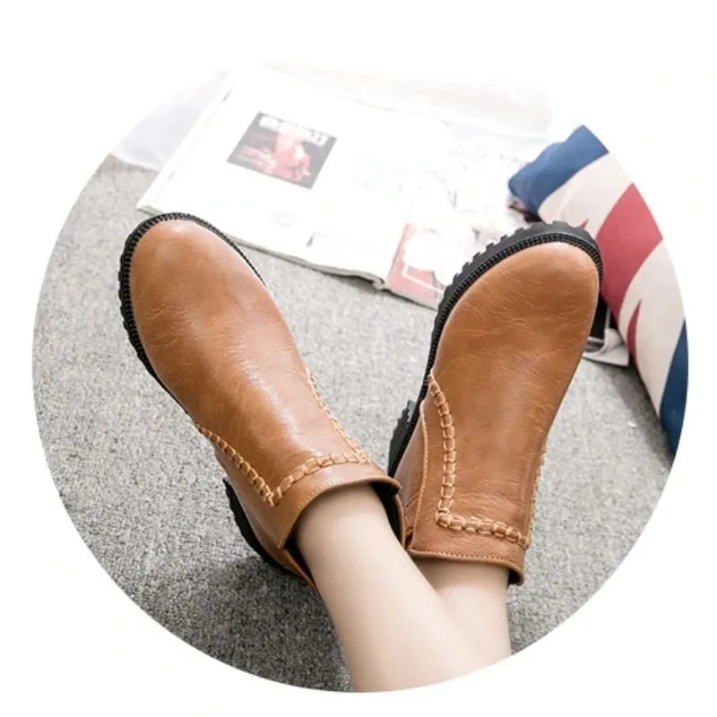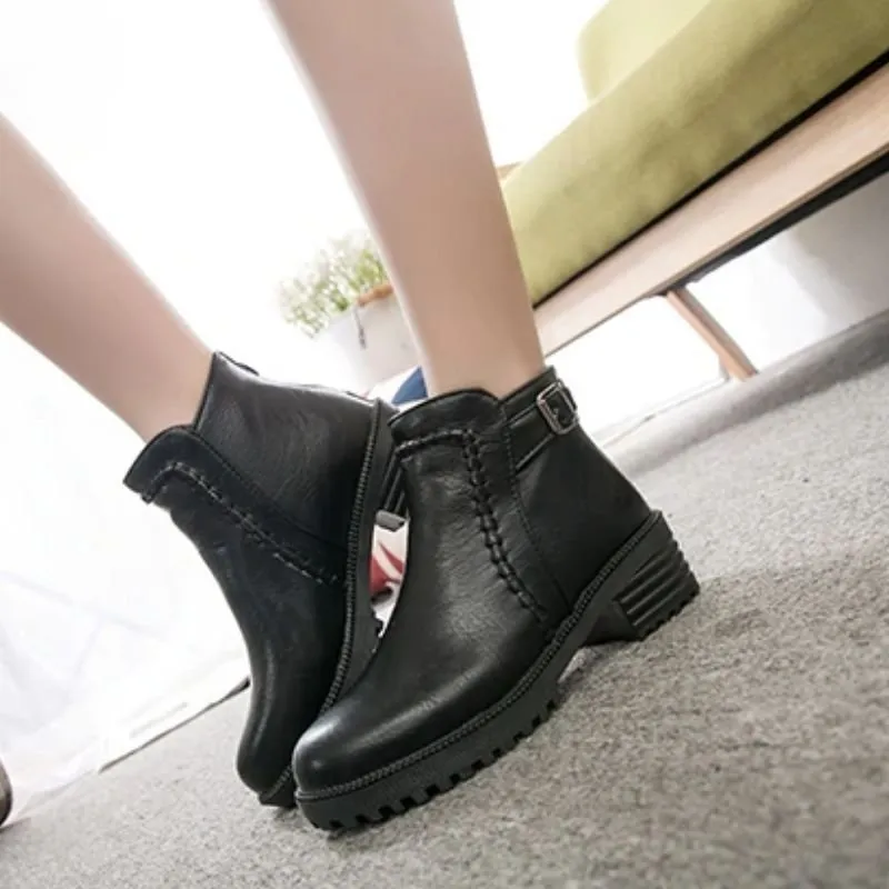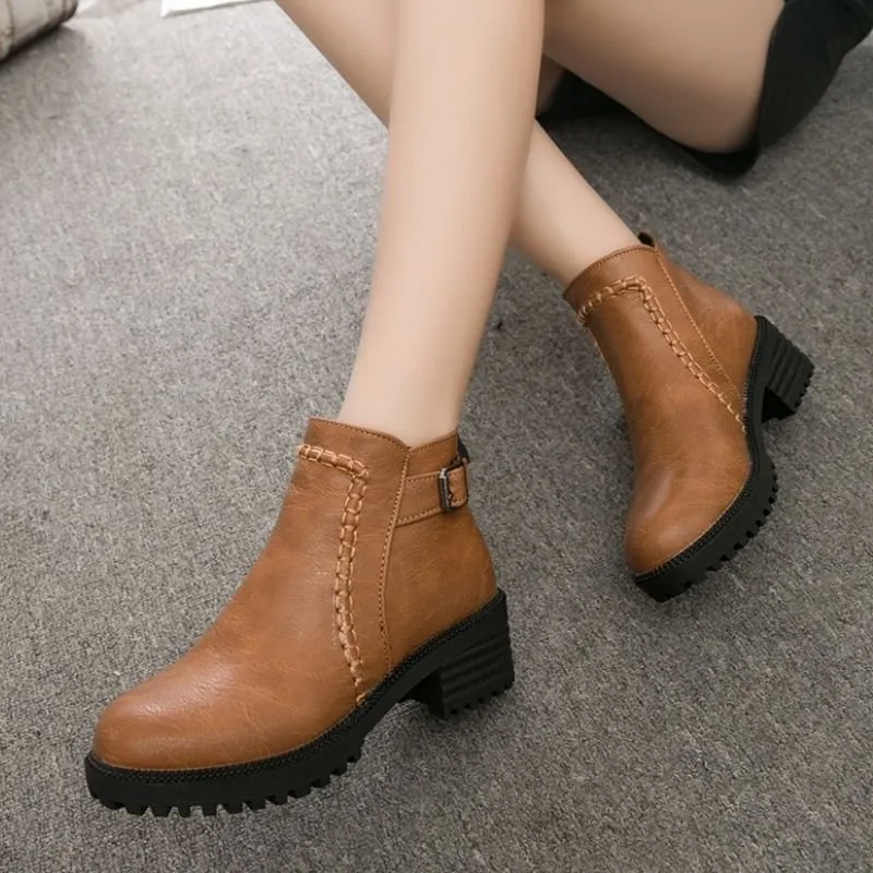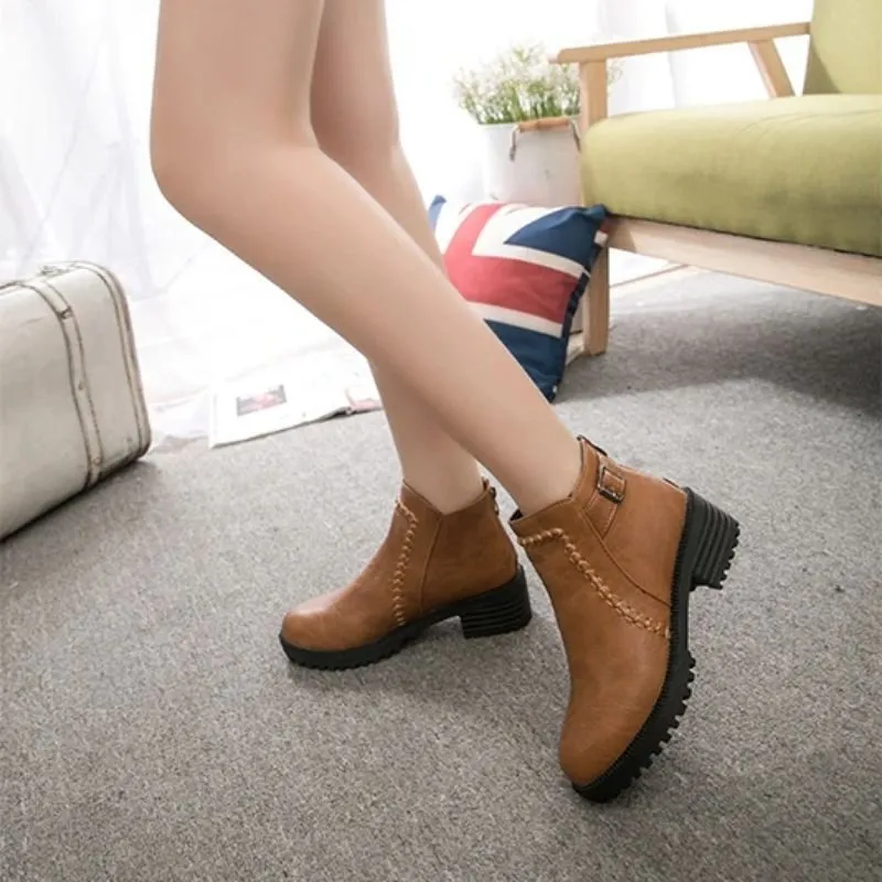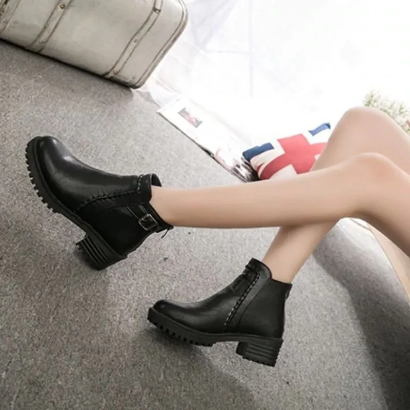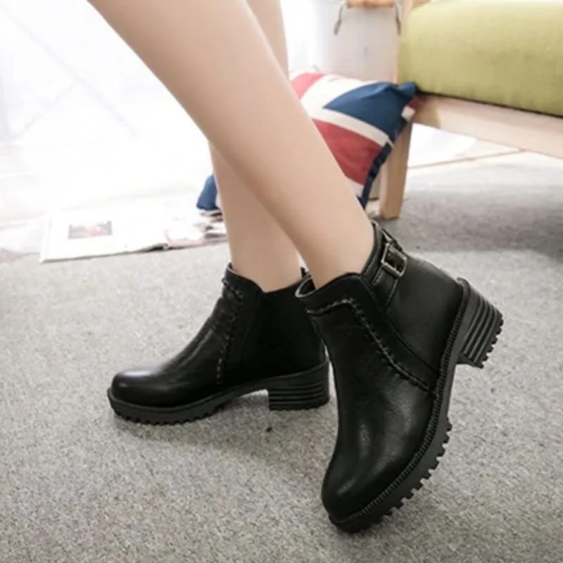 Bota cano médio com fivela na lateral, salto baixo e grosso e estilo vintage.