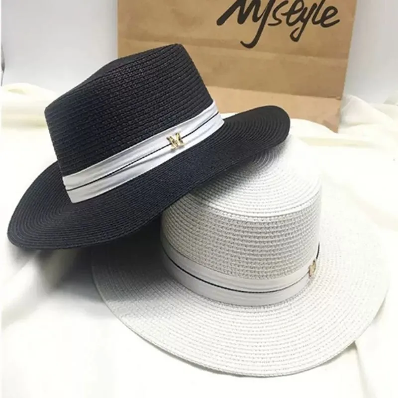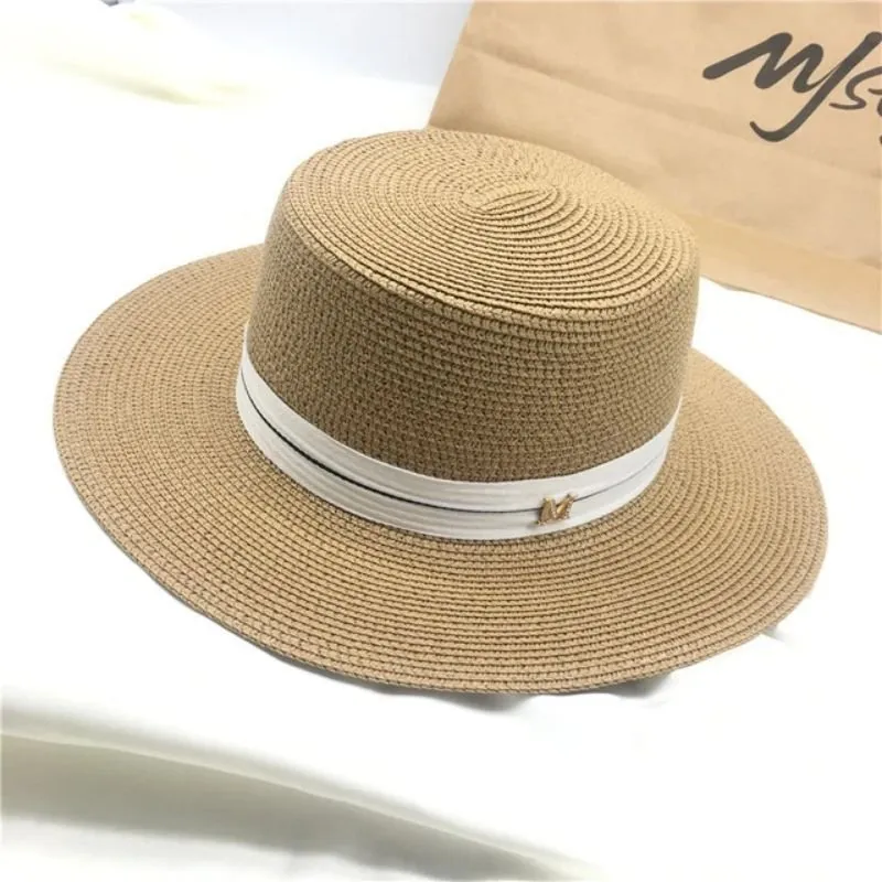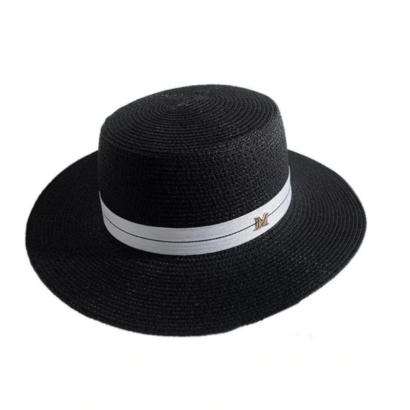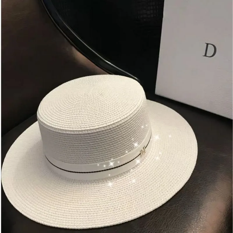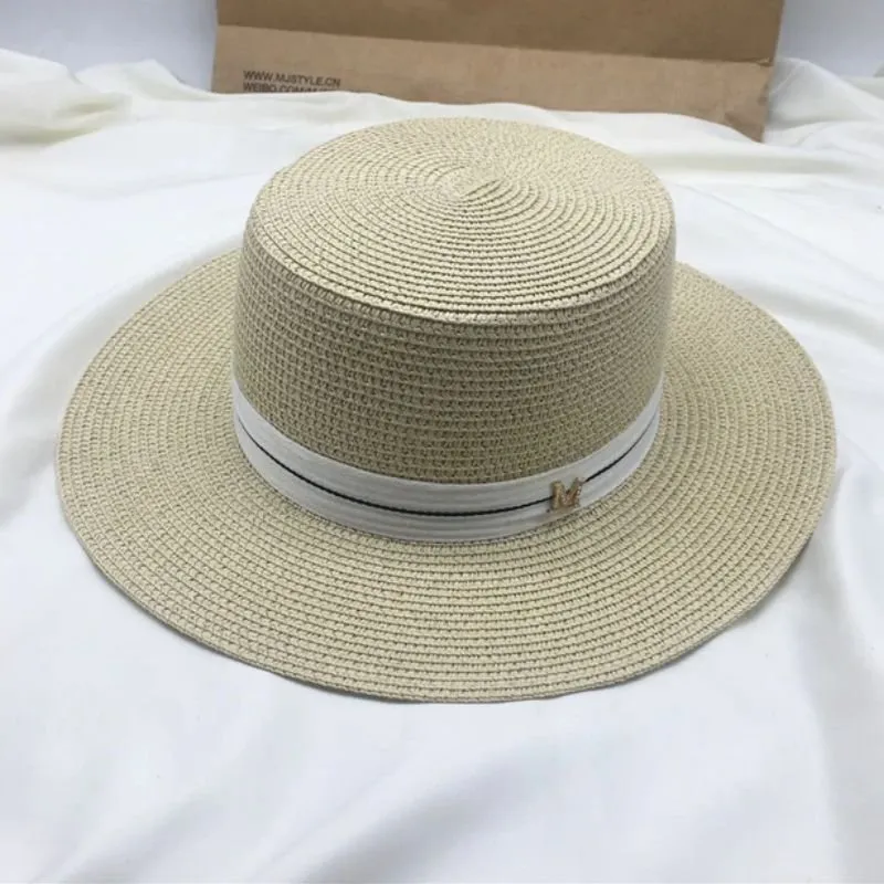 Chapéu em palha com formato redondo e detalhe de faixa em volta.