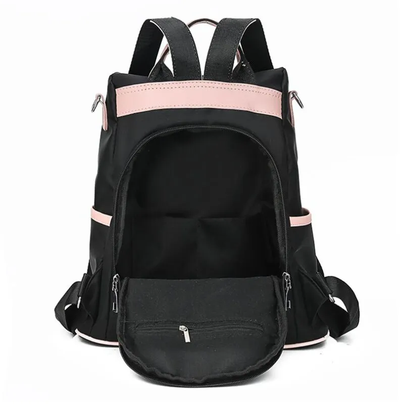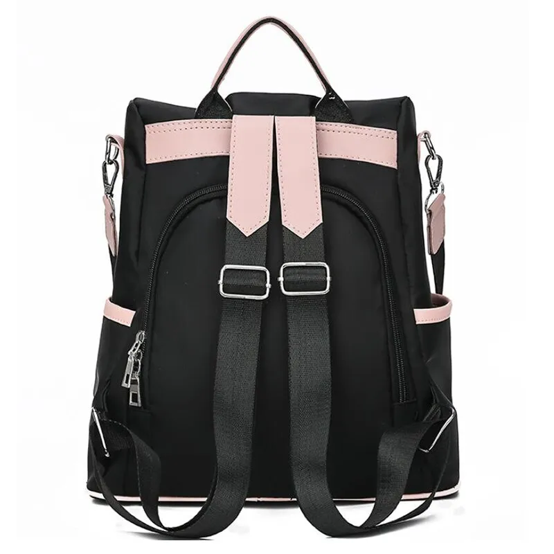 Mochila feminina preta com detalhes em rosa, abertura na parte de trás e bolso com zíper na parte da frente.