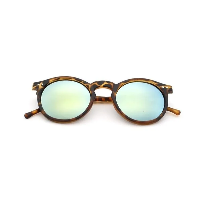 Óculos de sol de armação arredondada com estampa de oncinha, lentes de policarbonato espelhadas com brilho dourado e proteção UV.