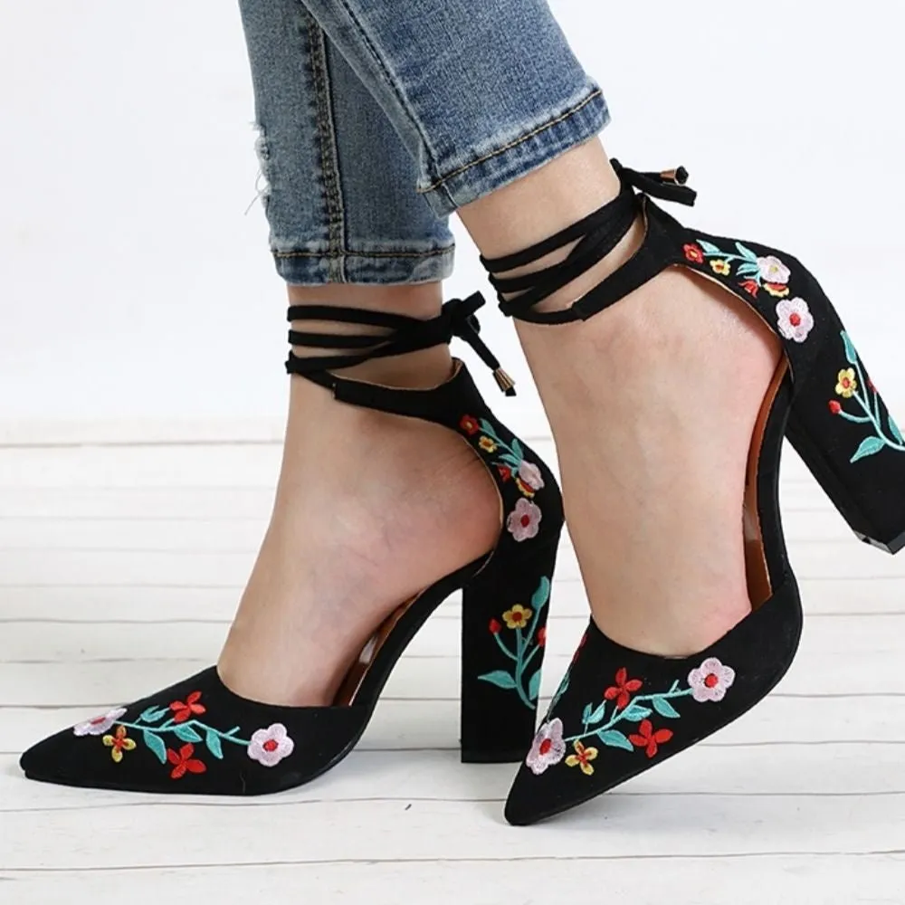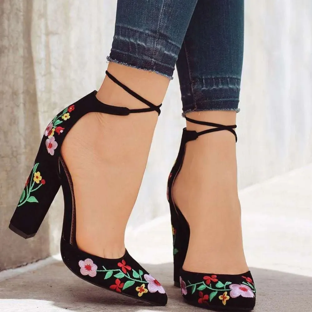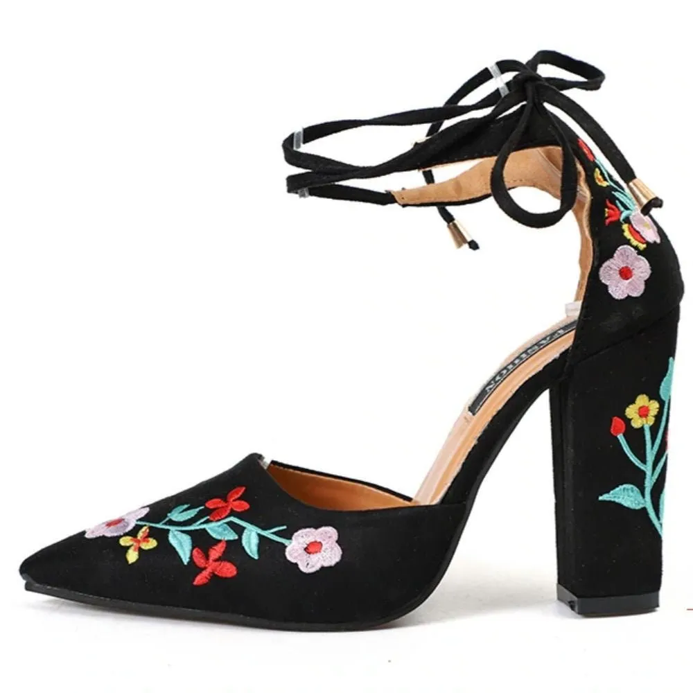 Lindo sapato bordado em flores com amarração no tornozelo.