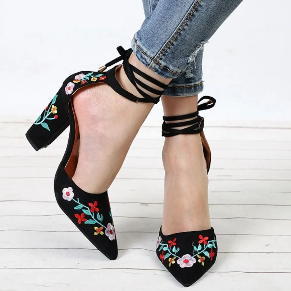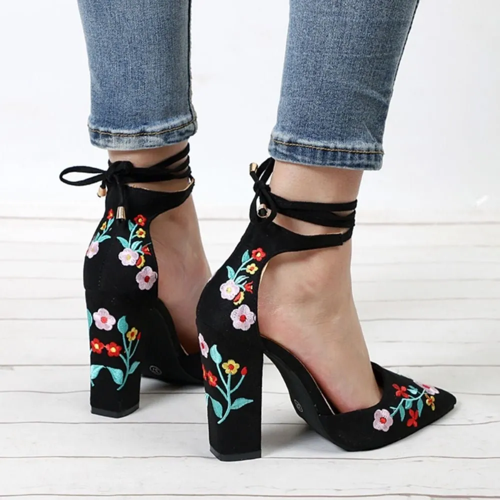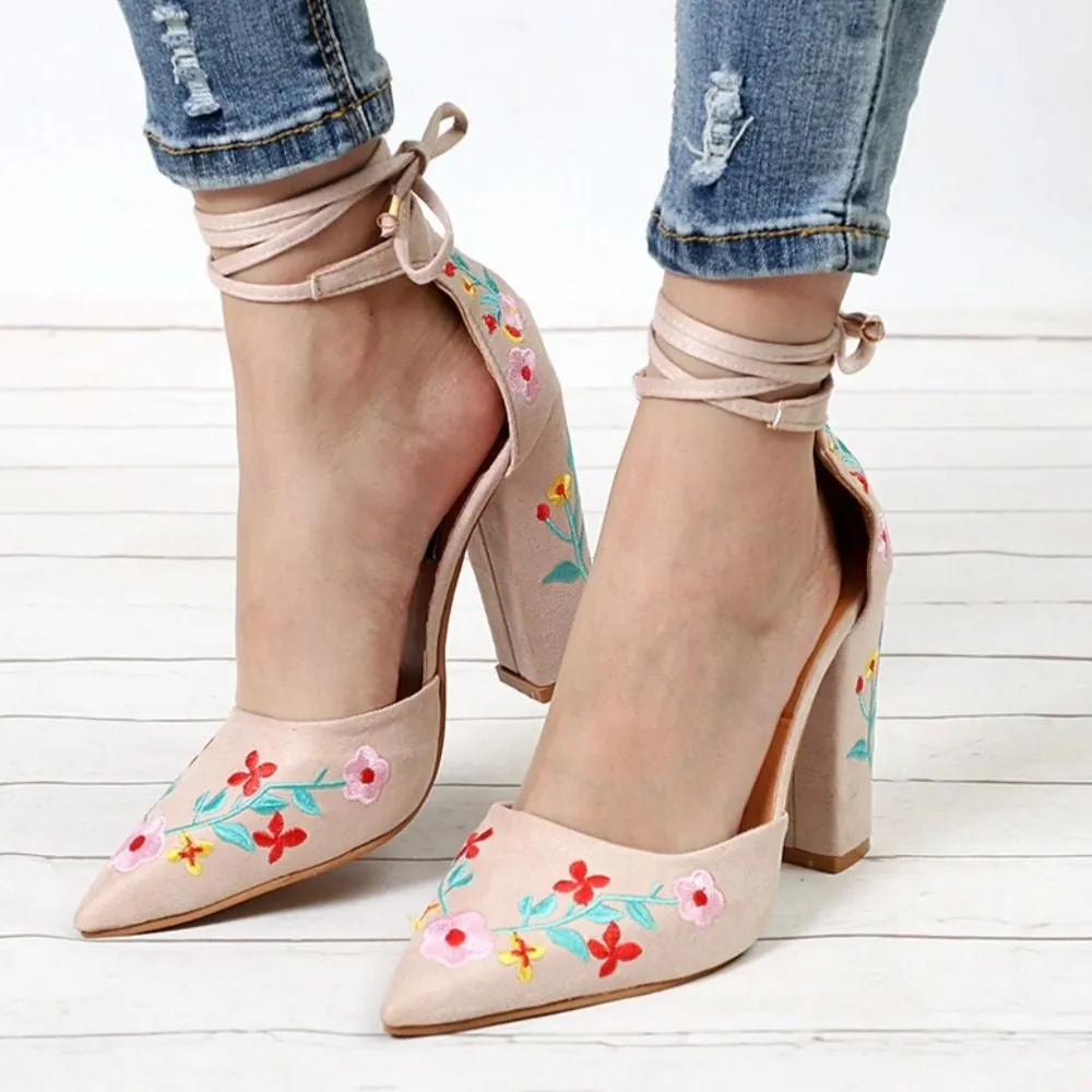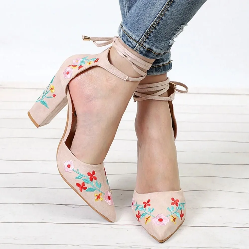 Lindo sapato bordado em flores com amarração no tornozelo.