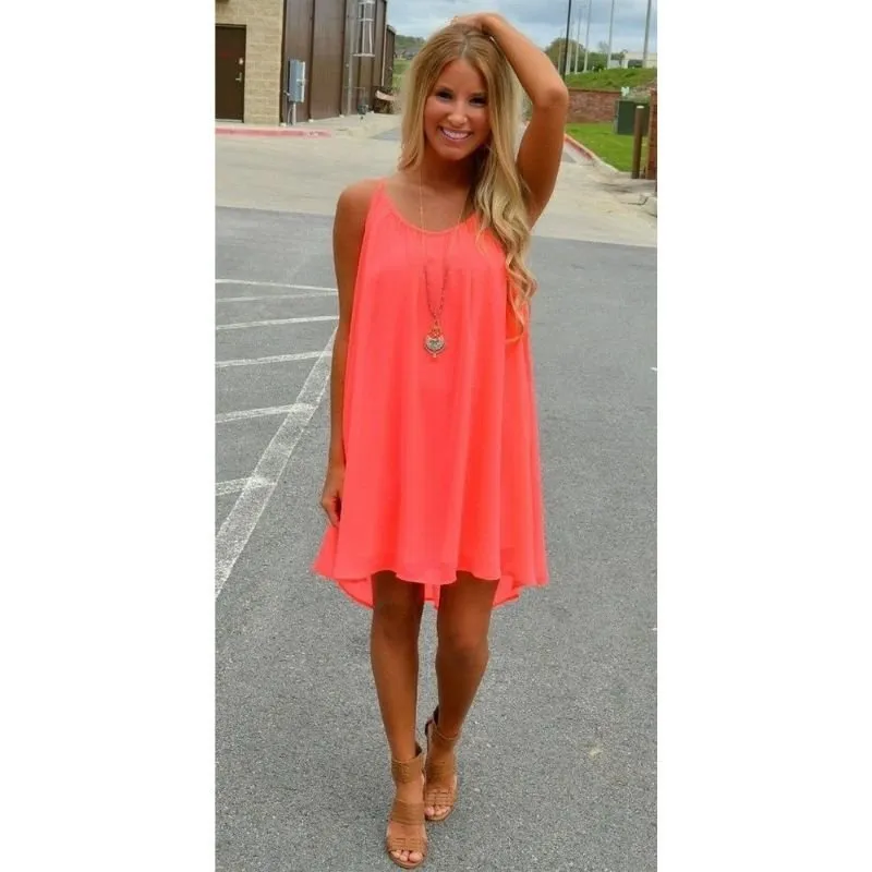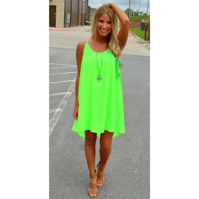 Vestido confeccionado em chiffon, com forro de malha na mesma cor do vestido. De modelagem soltinha, com alcinhas finas e decote nadador, com detalhe trançado nas costas. Em cores vibrantes fluorescentes, com a cara do verão, esta peça é feminina e perfeita para os looks casuais.