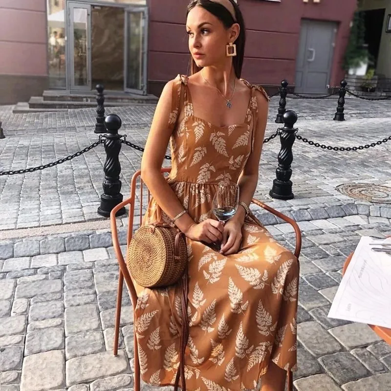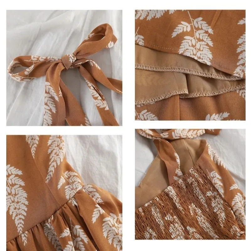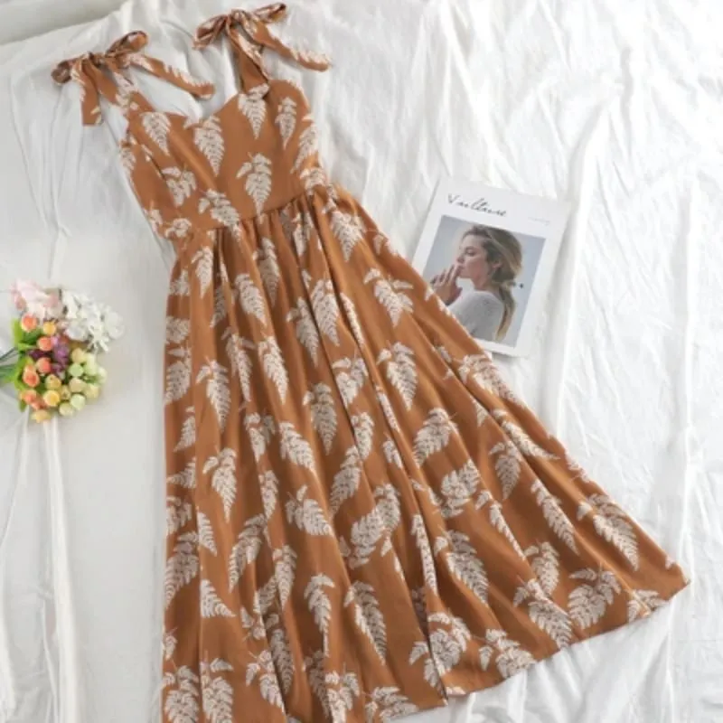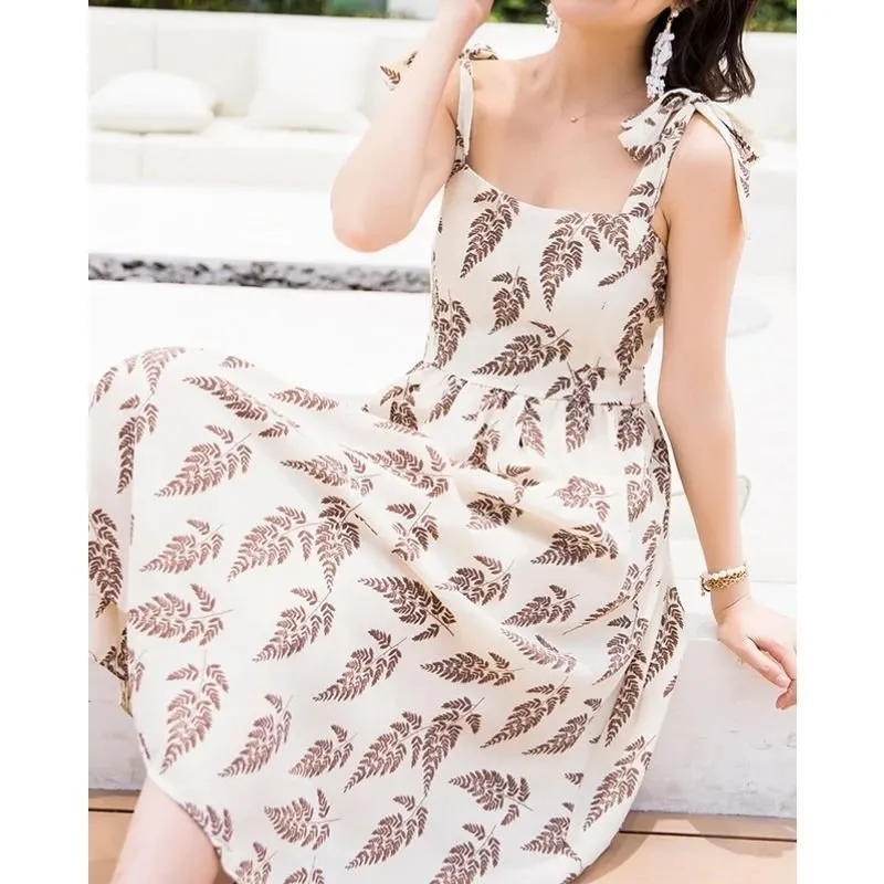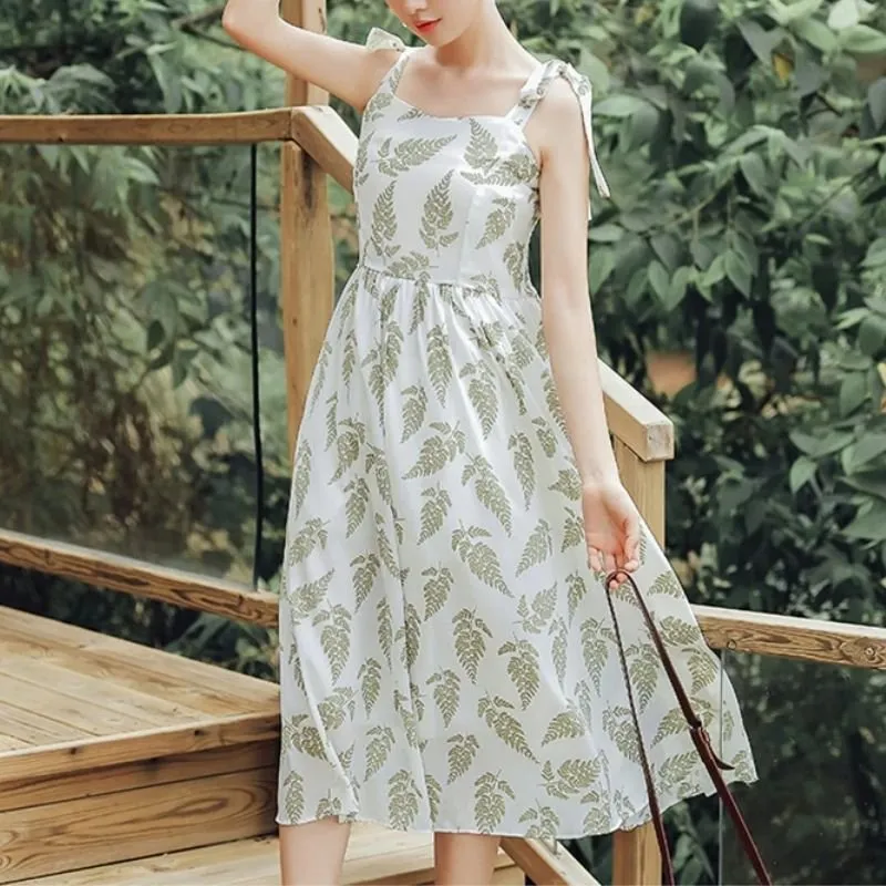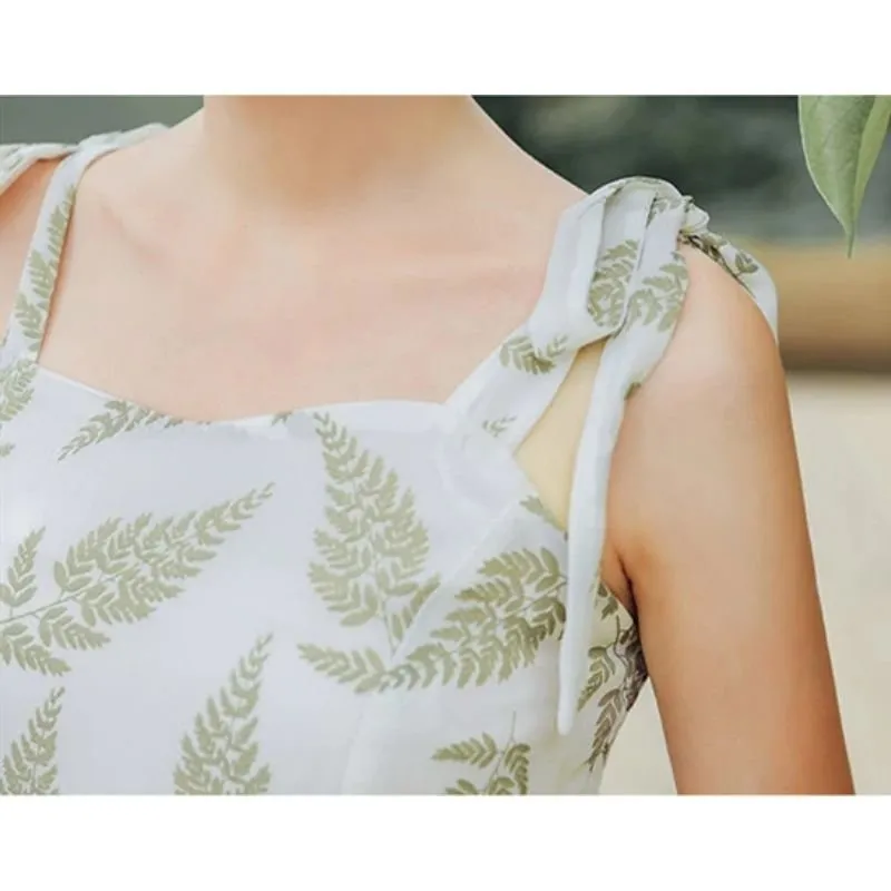 Vestido midi com estampa de folhagens delicadinhas e alça com amarração. Possui forro.